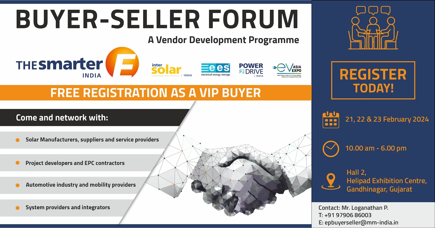 To facilitate the buyers of solar, electrical energy storage, e-mobility, and green hydrogen solutions ‘MM INDIA is organizing a ‘Buyer-Seller forum’ (Dated 21-23rd February 2024) - a vendor development platform at Hall-2, Helipad Exhibition Centre where buyers and sellers would engage in fruitful business discussions. This forum is aimed at fulfilling the requirement of large developers & EPC companies and connecting them with the best suppliers. The buyers will get a chance to shortlist the suppliers based on their requirements and engage in a very focused one on one discussion with them.