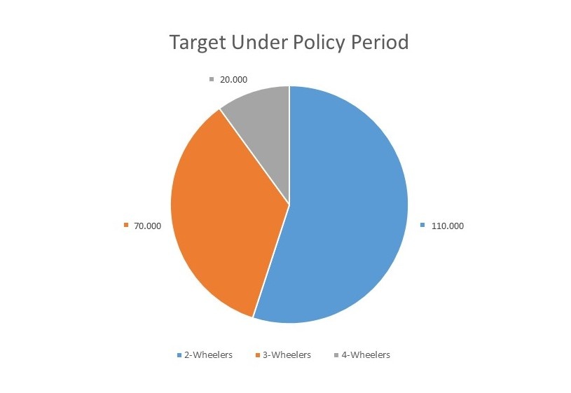 The policy aims to support the purchase of Two Lakh Vehicles during this 4-year period. Of the 2 Lakh vehicle target, more than 50% of vehicles is proposed to come from 2-wheelers and the rest from 3-Wheelers and 4-Wheelers. The detailed split can be seen below.