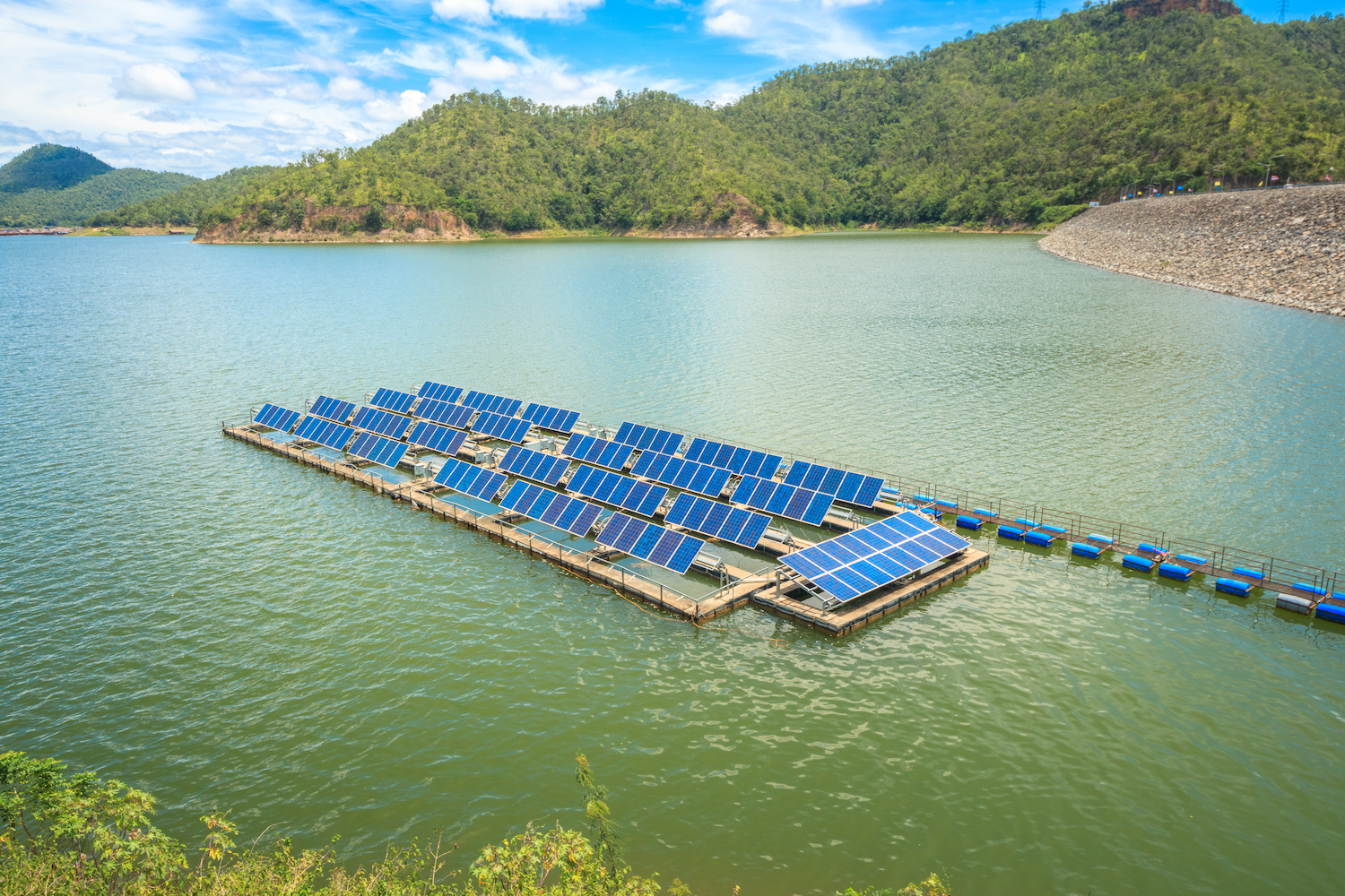 In floating solar systems, or "floatovoltaics," solar modules are made to float on water. The panels generate energy, which is transferred to a transmission tower through underwater wires.