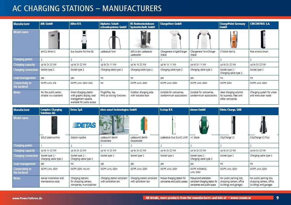 The Power2Drive Market Overview Charging Systems in cooperation with cosmix offers all interested parties – from specialists to newcomers in the field of charging infrastructure – a manufacturer-independent overview of the current charging systems on the market. True to our motto „Charging the Future of Mobility“, the market overview should enable you to easily compare intelligent charging systems to compare intelligent charging systems with regard to the most important parameters.